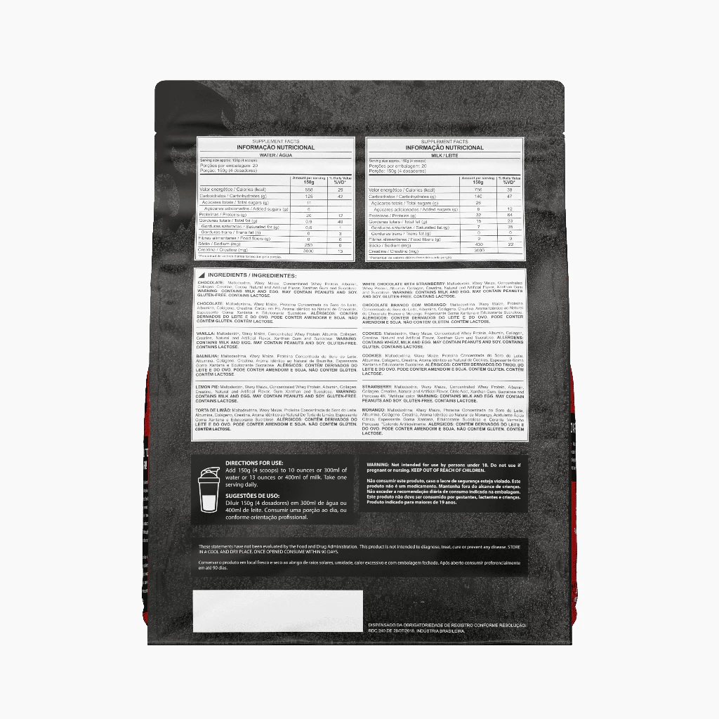 • Maltodextrina, Waxy Maize,proteína concentrada do leite,soro do leite, albumina, colágeno, creatina, espessante goma xantana e edulcorante sucralose.